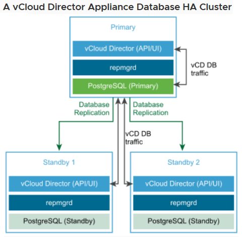 In my last blog, I walked through the process of Deploying the vCloud Director Appliance v10, and today’s blog will feature the process of deploying two additional standby appliances to create an HA database configuration for vCD. To get an idea of what that architecture would look like, I’ll rip this excellent diagram from VMware’s own documentation.