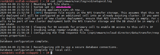 11 – After the appliance boots, look at the /opt/vmware/var/log/vcd/setupvcd.log to validate a successful cluster join. This log can also be used if the appliance deployment failed.