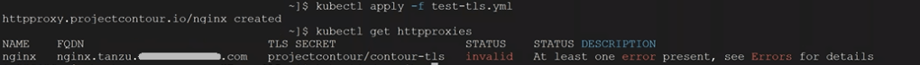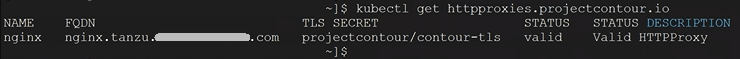7. Now you should be good to go. After you deploy your app, you should be able to check the httpproxies again for Project Contour, and see that it has a valid status