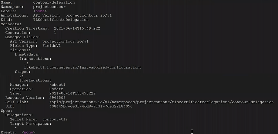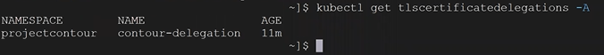 3. You check the TLS delegation to make sure it was created with the following command. In this example ours was called contour-delegation, and our namespace is projectcontour.