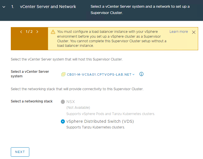 In this deployment example, I am only using the NSX-ALB controller with no NSX(NSXT) networks. vSphere Distributed Switch is selected by default. Click NEXT in the lower left.