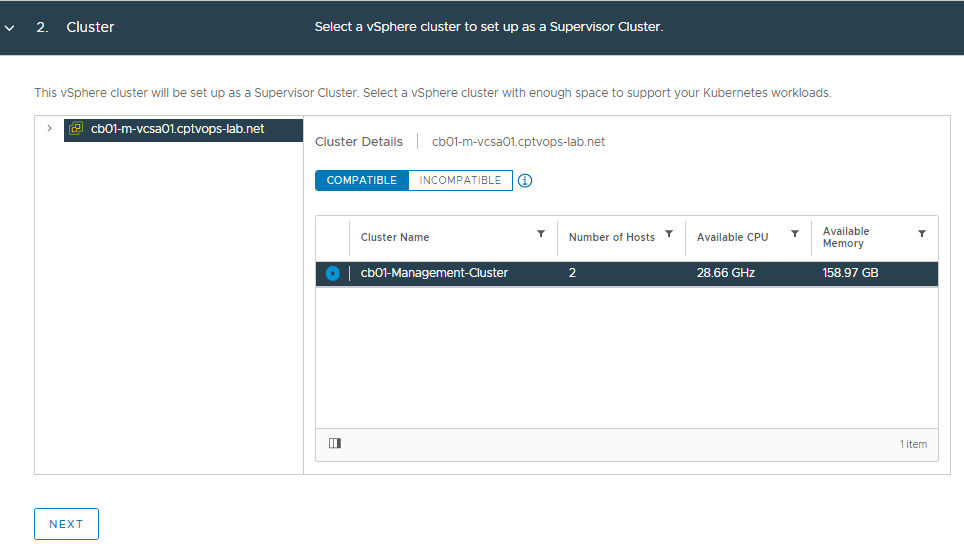 VMware recommends a minimum of 3 hosts in a compute cluster when enabling Tanzu for production deployments. However, this is a lab and I only have 2 hosts available. Select the desired compute cluster with HA and DRS enabled. If no cluster is compatible,