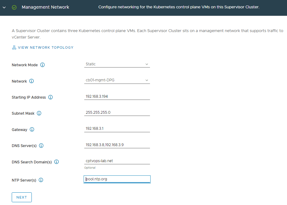 Refer to the spreadsheet, and fill in the details for the management network. Remember the control plane needs a block of 5 consecutive IP addresses.