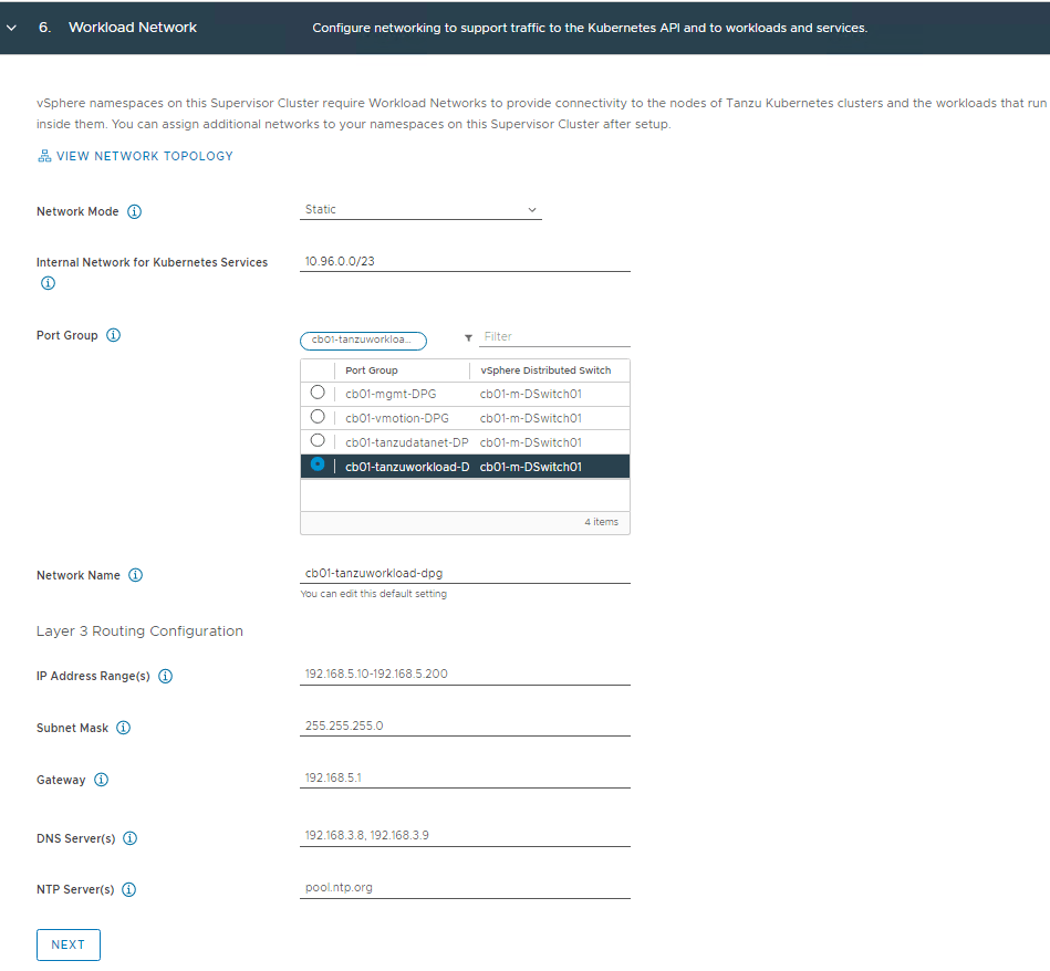 Refer to the spreadsheet, and fill in the details for the workload network. The “Internal Network for Kubernetes Services” default CIDR can be used. You can also specify your own if the default CIDR conflicts with other networks. This is strictly for internal communication.