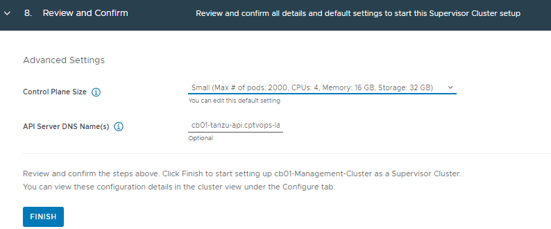Choose the Control Plane Size that fits your needs and add the API server DNS Name. A word of Caution: Even though the “API Server DNS Name(s)” section says ‘Optional’, I would still fill this in. Currently, there is no easy way to add it after the initial deployment.