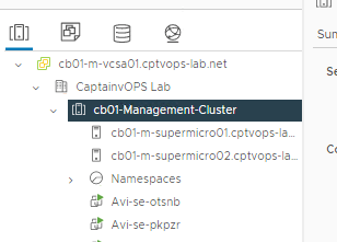 Browsing the vCenter inventory, you should now see a new object called Namespaces, with at least two Avi SE (Service Engine) VMs.