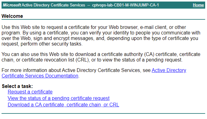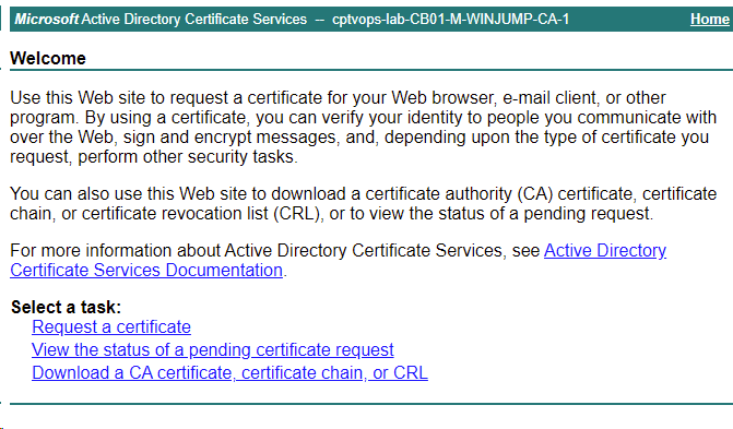 11. Now that we have downloaded the base 64 encoded certificate for the vCenter, we also need the CA certificate. We can download this from the Microsoft CA Web Portal homepage. Click “Download a CA certificate”
