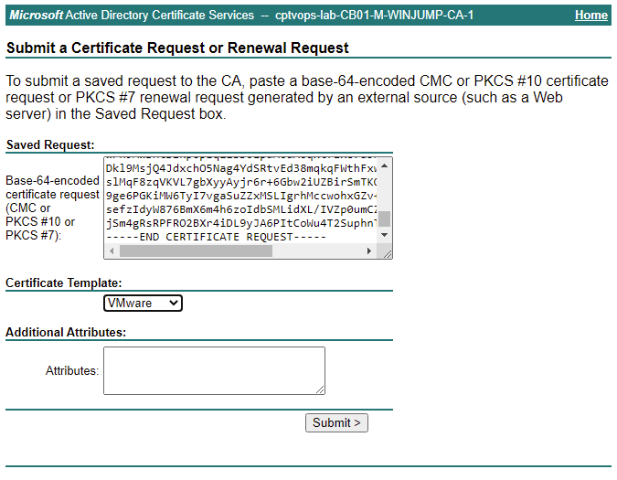 9. Paste the vCenter CSR created earlier into the saved request box. Next, chose the Certificate Template. I created a VMware template using the VMware knowledge base article here KB2112009.