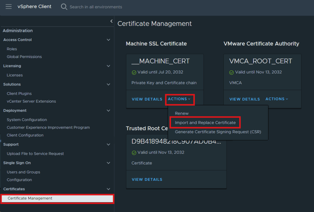 13. In the vSphere client Certificate Management screen, click the Actions drop menu and select “Import and Replace Certificate”.