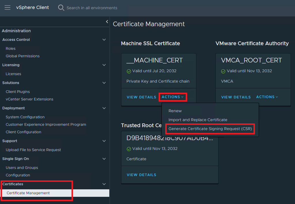 - On the Certificate Management screen, you will see Trusted Root Certificate at the bottom and Machine SSL Certificate at the top. In this example, we are only worried about the Machine SSL Certificate. Just below it, you will see an “Actions” drop menu, and from the menu we need to select Generate Certificate Signing Request (CSR).