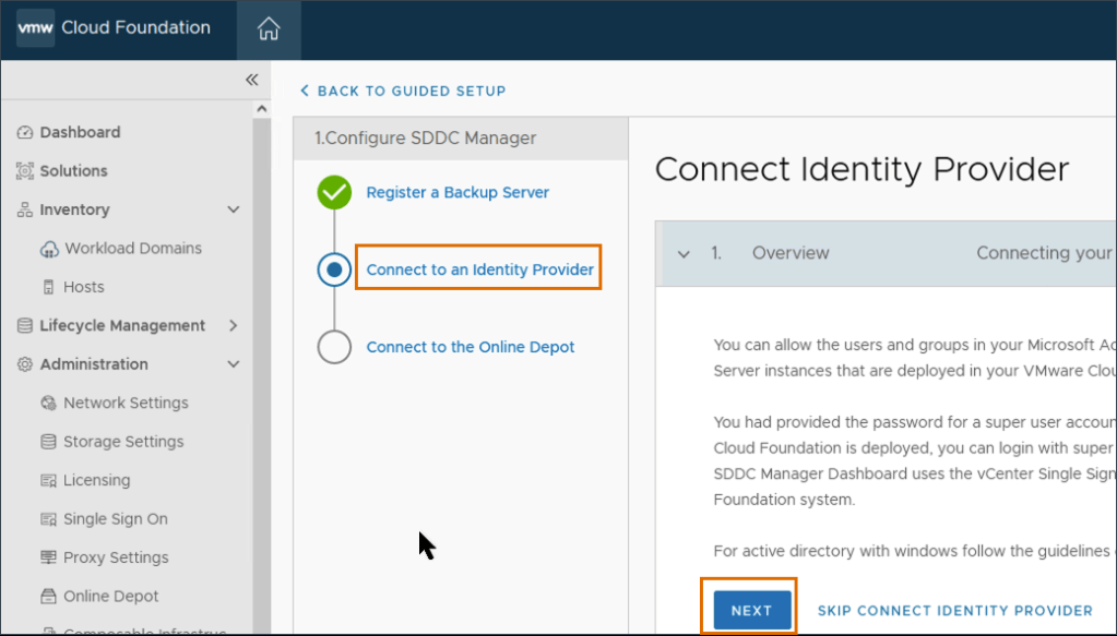 If there’s no proxy to configure for the SDDC manager to reach the internet, click SKIP CONFIGURE PROXY.