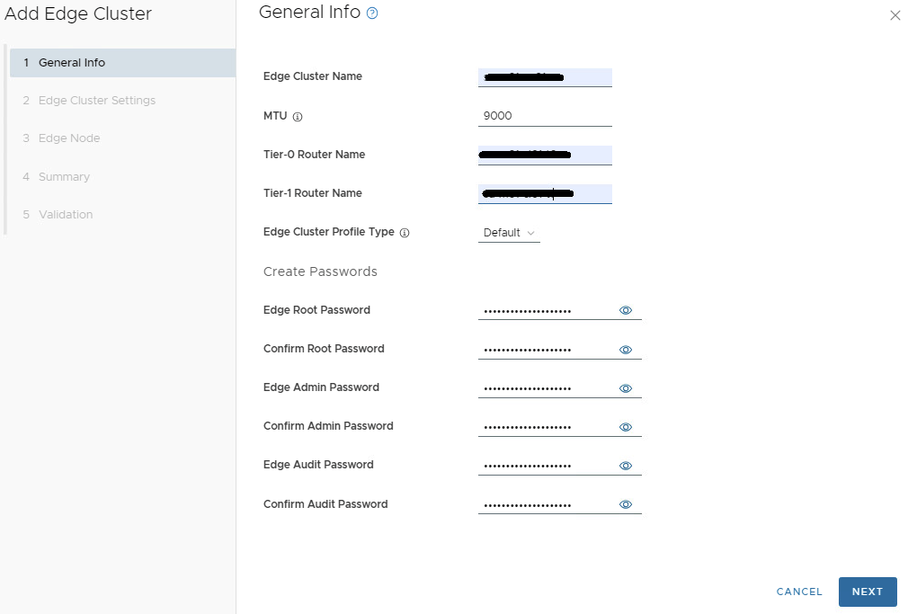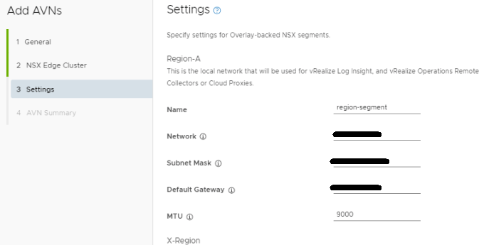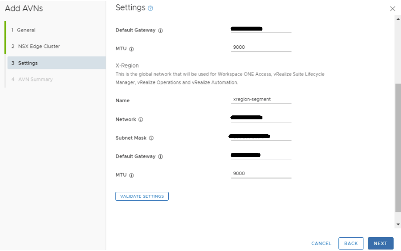 Fill out the network specs for the X-Region section. An MTU of 9000 was used here to keep the MTU consistent in the environment. Click VALIDATE SETTINGS, and then click NEXT after the validation succeeds. Otherwise, remedy the errors and validate the config again.