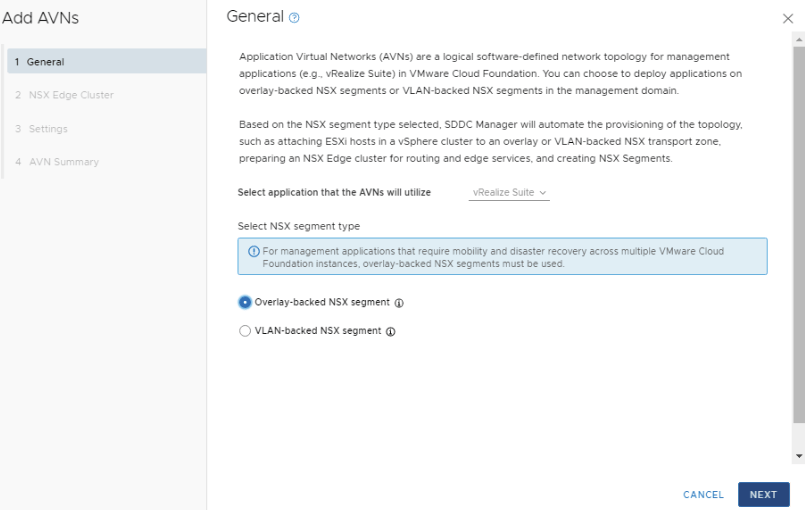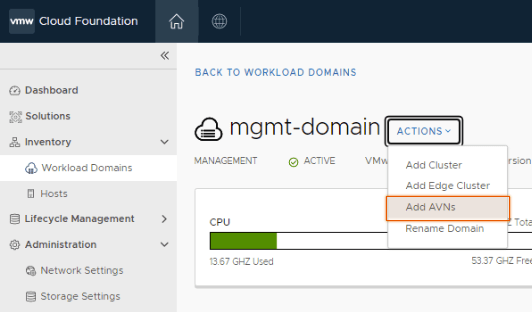 For more information, see VMware’s documentation Deploying Application Virtual Networks in VMware Cloud Foundation.