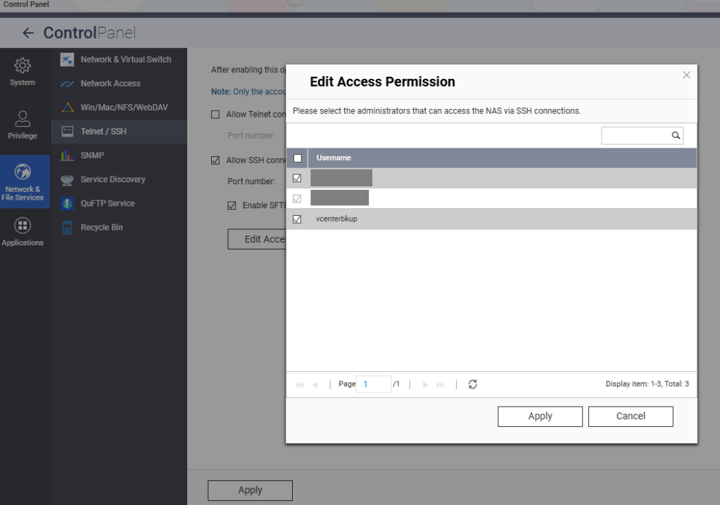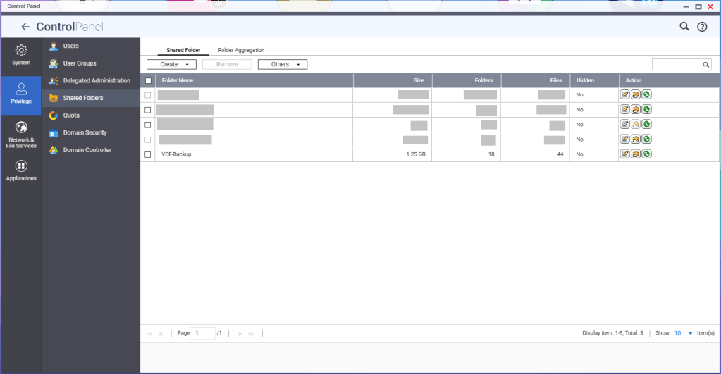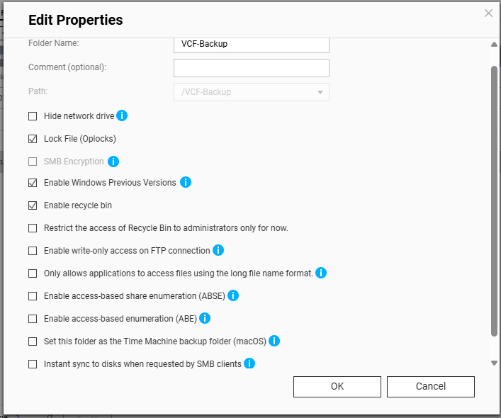 You’ll need to create a shared folder on the NAS, and assign the service account created earlier, in this example ‘vcenterbkup’, with read/write privileges. In this example, I used the folder name of ‘VCF-Backup’.