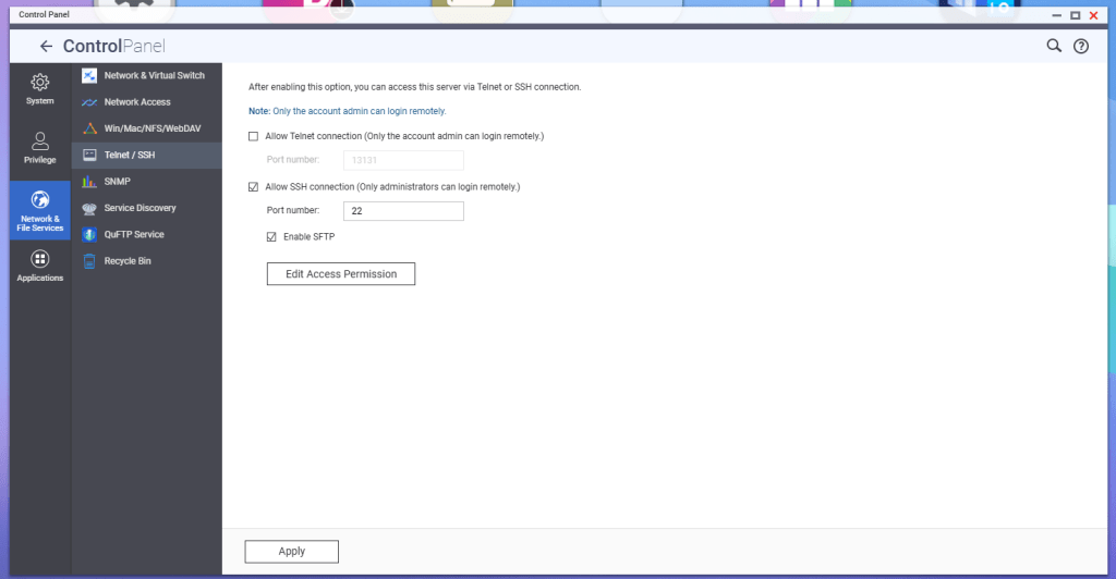 According to QNAP, in order to enable SFTP connections to the NAS, the SSH service must be enabled first, and then the SFTP enablement will be available. Go to Telnet/SSH in the Control Panel, and enable these services.