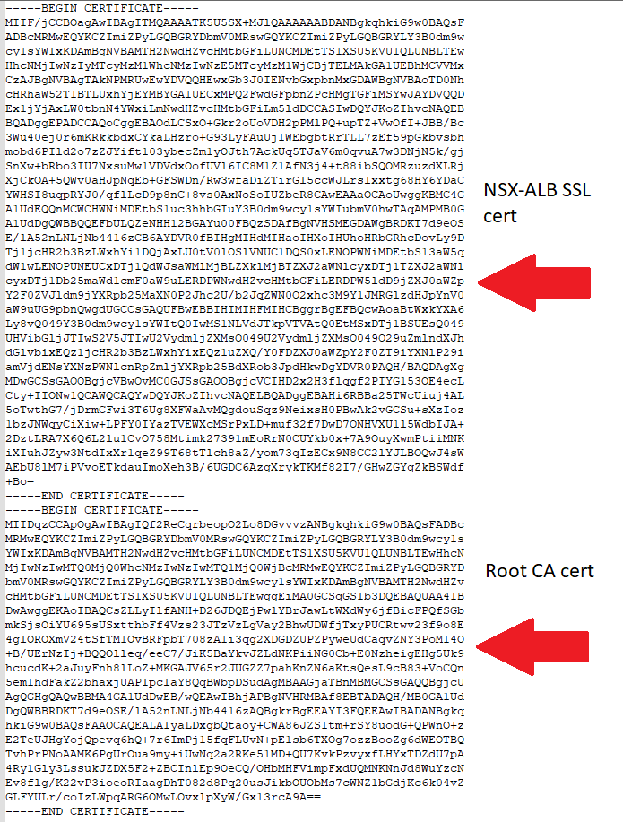 Refer to the spreadsheet, and fill in the information for the NSX-ALB controller. You will also need to log into NSX-ALB and get the certificate for the controller. This can be found on Templates > Security > SSL/TLS Certificates. Click on the down arrow to the right of the controller to export, and then on the new screen that opens, under Certificate, click COPY TO CLIPBOARD.