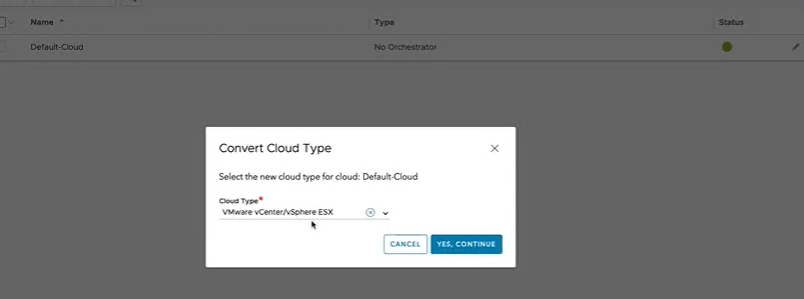 On the Convert Cloud Type window, select “VMware vCenter/vSphere ESX” in the cloud type drop menu. Click YES, CONTINUE.