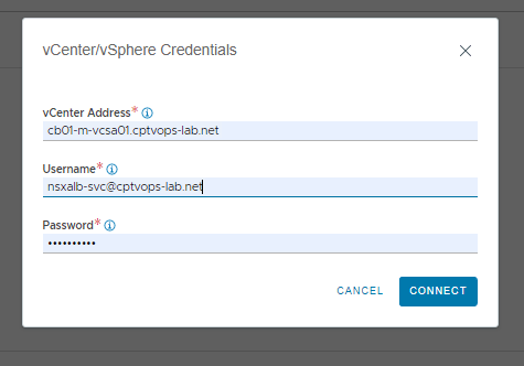 Here you will need to add the FQDN of the vCenter, along with the service account the controller will use to access the vCenter. We can use the example spreadsheet we filled out earlier. Click CONNECT.