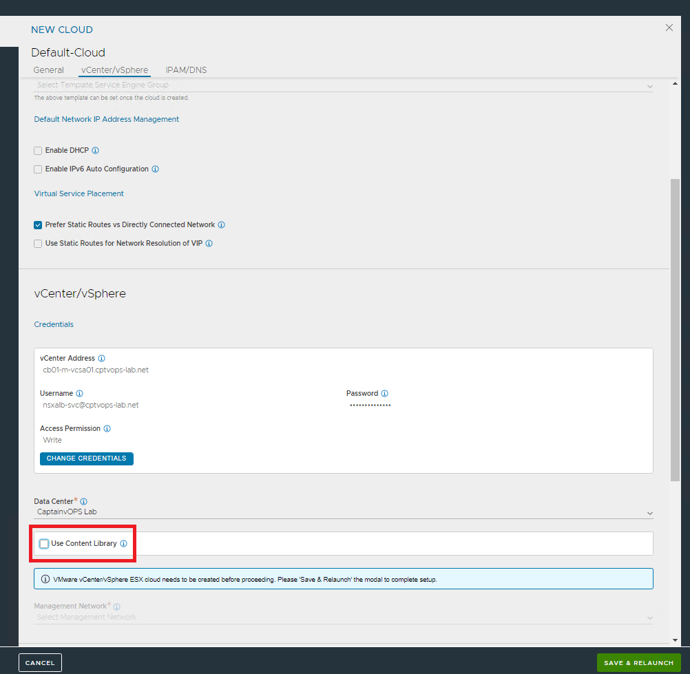 This will kick you back to the setup wizard. However we now see a little blue information bar “VMware vCenter/vSphere ESX cloud needs to be created before proceeding. Please ‘Save & Relaunch’ the modal to complete setup.” However, the SAVE & RELAUNCH button in the lower right corner is grayed out. We first need to deselect the “Use Content Library” . Now we can click save & relaunch.