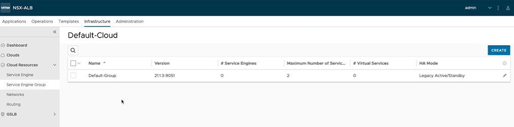 For that, we click the Infrastructure tab, and then on the left we expand Cloud Resources, and select Service Engine Group.