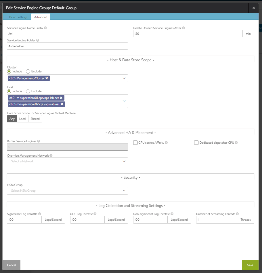1 – Click the pencil on the default-group. 2 – The default configuration, the Legacy HA is already configured to be Active/Standby. This is the only mode available to the essentials license. 3 – The number of Virtual Services per Service Engine, is 10 at default. This is the number of load balancing services the SE will support. Each Tanzu cluster you create, will consume one of these load balancing services, and every service you expose from the tanzu cluster will consume a service. This can be turned up to 1000 depending on your needs. 4 – The maximum number of service engines is limited by the essentials license used.