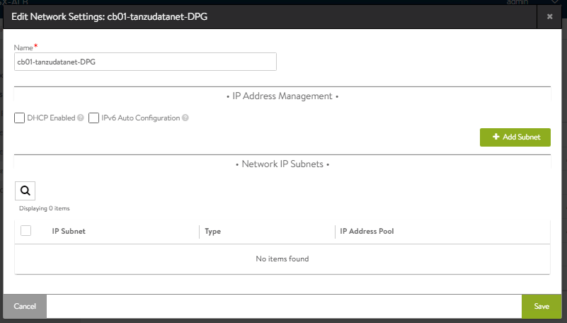 Click the ‘+ Add Subnet’ button. Refer to the spreadsheet again, copy the ‘Data Network CIDR address’, and paste it into the ‘IP subnet field’. Also click the ‘+ Add Static IP Address Pool’ button, and copy the pool for the Data Network off the spreadsheet. End result should look similar to this.