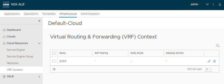 On the left hand side, select VRF Context to configure the routing. To the right of ‘global’ select the edit button.
