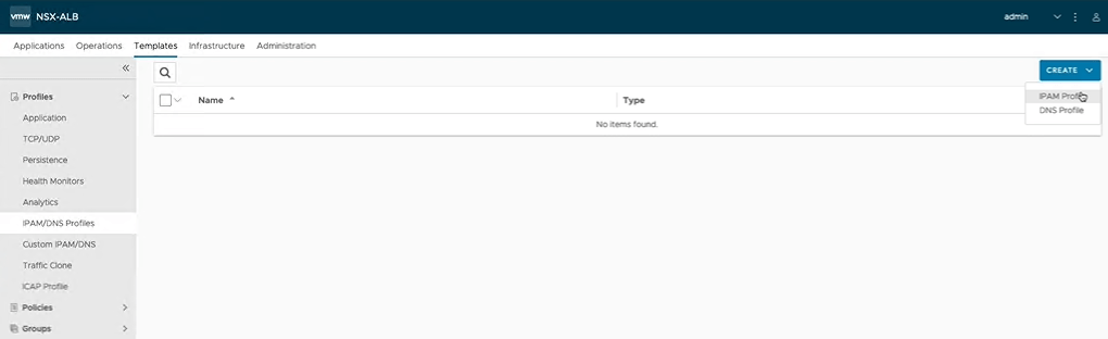 1 – Click on the Templates tab, and then under Profiles, select IPAM/DNS Profiles. 2 – Click the CREATE button, and select ‘IPAM Profile’ from the drop menu. With the essentials license, we can only create an IPAM Profile.