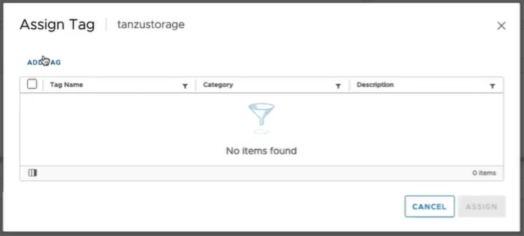 1 – in the vSphere inventory, select the desired storage to house the Tanzu Kubernetes workloads. 2 – Under tags, click assign.