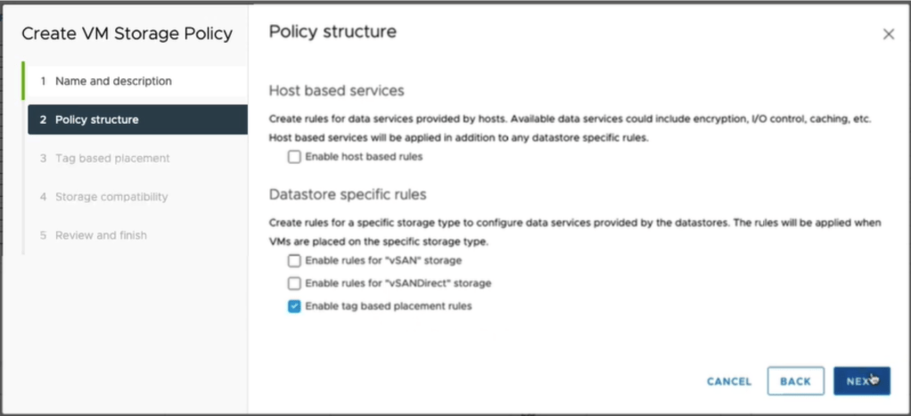 4 – On Policy structure, Enable tag based placement rules. Click NEXT